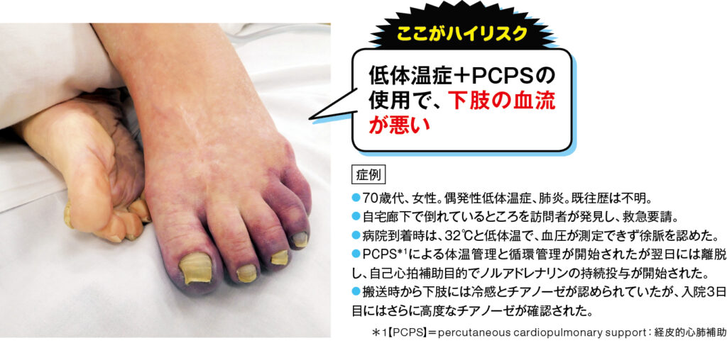 身体局所における血流の低下は、褥瘡発生のリスク要因です。この患者さんは低体温症となった結果、下肢にチアノーゼを引き起こしています。