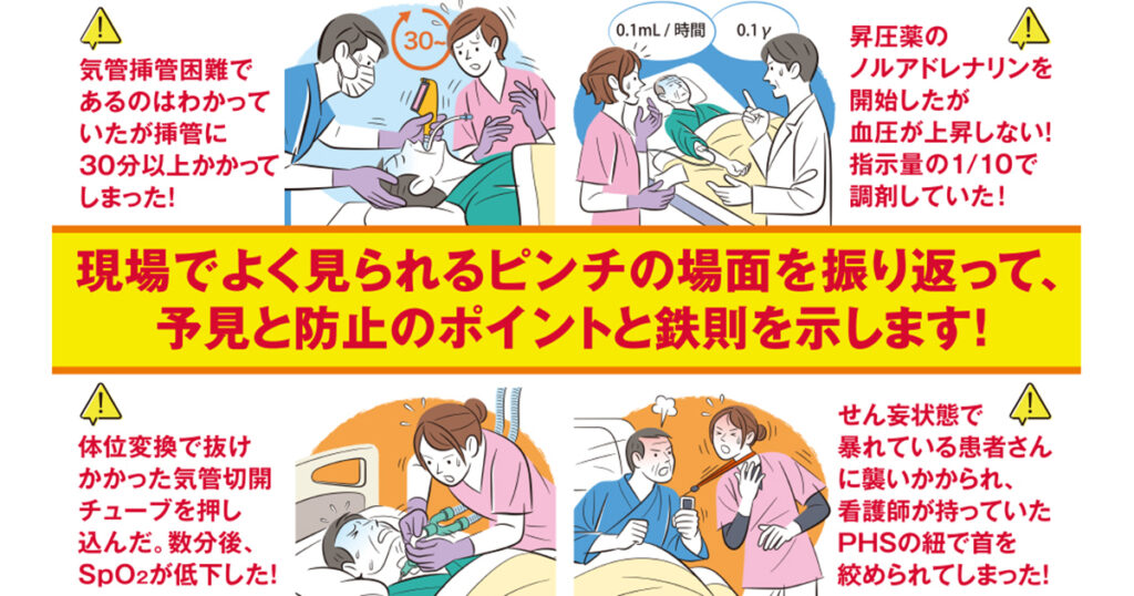 ショック状態などの急変対応ほか、あらゆる場面を幅広く網羅しつつ48例をピックアップ。「気管挿管困難であるのはわかっていたが挿管に30分以上かかってしまった!」「昇圧薬のノルアドレナリンを開始したが血圧が上昇しない! 指示量の1/10で調剤していた!」といった“ピンチ”を取り上げる。