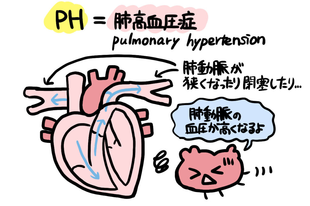 肺動脈の血流が血管の狭窄や閉塞によって悪くなることで、肺動脈の血圧が高くなるよ。