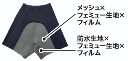 裏地の股部には、消臭効果のある生地「フェミュー」を採用。また、表面への滲み出しをよりしっかりとカバーしたい股ぐり部分は、防水生地を使用。ソフトな風合いで体にフィットしやすくなっている。