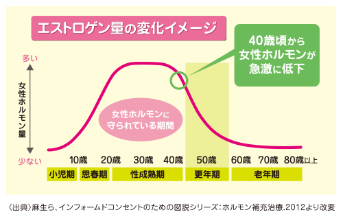 しかし40歳を過ぎる頃になると、エストロゲンの分泌量は急激に低下。閉経前後の10年間にあたる「更年期」と呼ばれる世代になると、さまざまな身体の変化が起こりはじめます。
